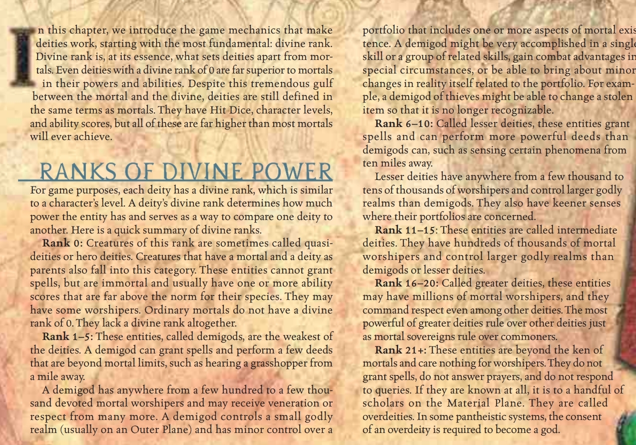 All previous abilities, Abstract Existence (Gods are concepts and symbols, embodying every aspect of their portfolios), Beyond-Dimensional Existence, Immortality (Types 1, 2, 3 & 8. All deities are naturally immortal and cannot die by natural causes. Gods cannot be slain by anything short of a god of greater power than their own, or a god wielding an artifact. Any god that suffers an attack that should destroy it simply disperses, then reassembles later. Deities can't truly die as long as they aren't killed on their home plane of existence), Chaos Manipulation & Law Manipulation (When the gods created the worlds and various planes of existence, they did so by manipulating chaos and law), Avatar Creation (Gods can create avatars at will), Teleportation (All gods possess the innate ability to instantly teleport to any point on the same plane. They can do this at will and without any chance of error), Regeneration (High-Godly: Gods cannot be slain by anything short of a god of greater power than their own, or a god wielding an artifact. Any god that suffers an attack that should destroy it simply disperses, then reassembles later. This would include regeneration from spells like Truenaming Magic, which can conceptually erase/rewrite a foe by the caster's will), Regeneration Negation (High-Godly: Gods are the only ones capable of permanently killing each other/other gods), Initiative (When dealing with mortals, all gods automatically receive the initiative, always being able to attack first), Conceptual Manipulation (Type 3. Demigods and above are capable of bending reality based on their Portfolios and Domains- these represent the aspects of reality they represent and command, with greater control being exerted by more powerful gods. Truenaming Magic encompasses all of creation and reality on its entirety, hacking into the fundamental construct of creatures, objects, ideas, etc., with its words and phrases changing the building blocks of reality, influencing everything that currently is, everything that ever was, and everything that will ever be), Shapeshifting (Lesser Gods can change into any inanimate object they desire), Dimensional Travel (Can travel between different planes of existence at will), Greater Enhanced Senses & Clairvoyance (Lesser Deities always know what is happening within 10 miles of themselves or their worshippers), Resurrection (Can raise any previously living mortal being from the dead), Dream Manipulation (Can communicate with their worshippers through dreams), Power Bestowal (Can grant their worshippers any power that does not exceed their own), Self-Sustenance (All types. Deities do not need to eat, sleep or breathe), Passive Mind Manipulation, Fear Manipulation & Willpower Manipulation (Gods emanates a divine aura that passively emits mind/fear/will-controlling effects), Size Manipulation (Can increase their own size and/or of their weapons), Forcefield Creation (Can create a transparent shield to protect from melee attacks/spells. A tangible field of divine energy encompasses and suffuses a deity's body), Existence Erasure (Can force a being to undergo erasure), Extrasensory Perception (Capable of seeing illusions, transmuted creatures and objects, and disguised creatures or objects for what they really are), Plant Manipulation (Can make plants grow in any place), Energy Projection (Via Divine Blast), Social Influencing (Can verbally convince others to take some course of action), Probability Manipulation (Gods' actions always work. Any chance to succeed is a succeed), Damage Reduction (Deities passively reduce any damage actually taken substantially), Dimensional Travel (Can travel between the various planes of existence at will), Sense Manipulation (Gods can disable the supernatural senses of those within their range of influence), Telepathy (All Gods can telepathically communicate with others via Remote Communication), Heat Manipulation, Gravity Manipulation, Time Manipulation, Power Nullification (Gods can change or apply the temperature, gravity, time or spell functions of their realms at will), Resistance Negation (The abilities of a god cannot be resisted).