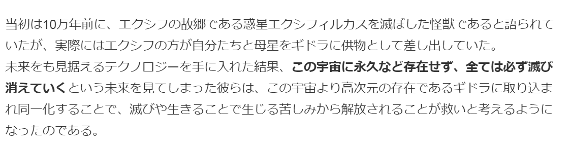 King Ghidorah is the mysterious deity the Exif worshipped. One day, they summoned Ghidorah and he destroyed their homeworld, Ghidorah would then destroy many worlds and stars during many years until he came back into the dimension he existed within. Ghidorah, similar to his other counterparts, has his iconic three heads but most of the body is missing. Thousands of years later, Ghidorah would reapear in the lower dimension thanks to his summoning by Metphies, so that he could once again devour planets.
