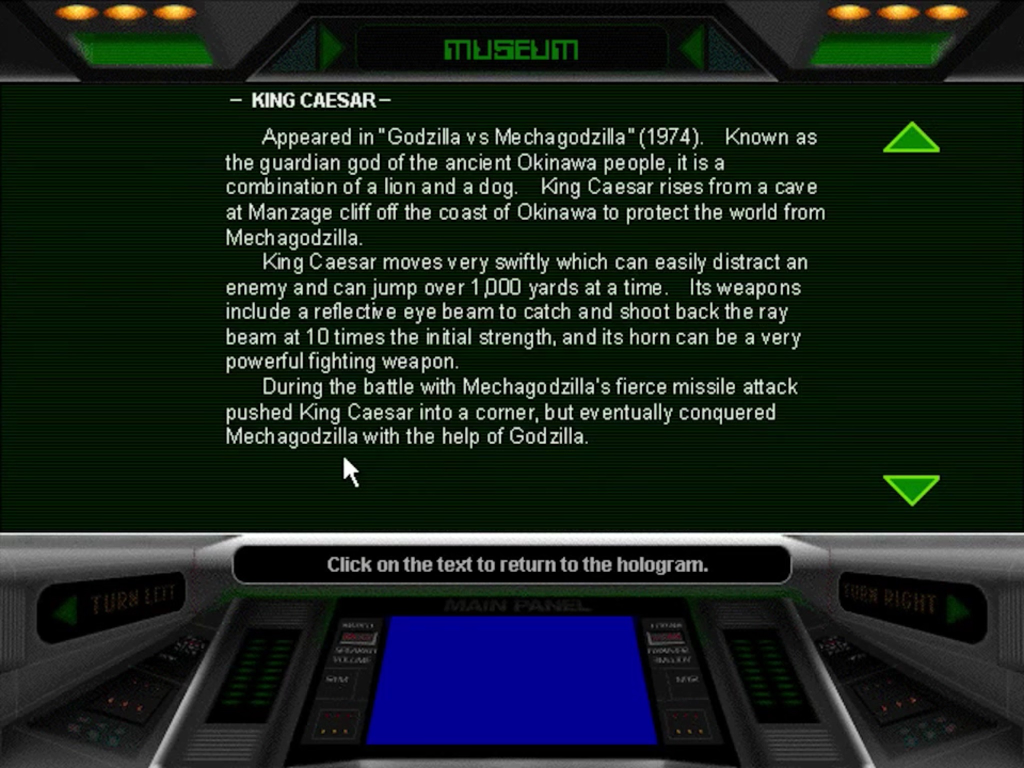 Weaknesses: Mechagodzilla is critically impaired by damage to its Cybaneck, a control receiver mounted on the sides of its head. In the machine's first encounter with Godzilla, it was rendered inoperable after sustaining damage to the Cybaneck following an explosion caused by a beam clash, though it was still able to receive orders to retreat. Godzilla destroyed Mechagodzilla in their battle in Okinawa by tearing off its head. In Terror of Mechagodzilla, Mechagodzilla's control device was instead located inside of the cyborg Katsura Mafune. In a similar manner, when Katsura was killed, Mechagodzilla was rendered defenseless.