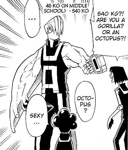 Dupli-Arms: Mezo's Quirk grants him a set of tentacles alongside his arms. He can transform the tips of these tentacles to replicate other parts of his body. The duplicated body parts are more efficient than the originals.