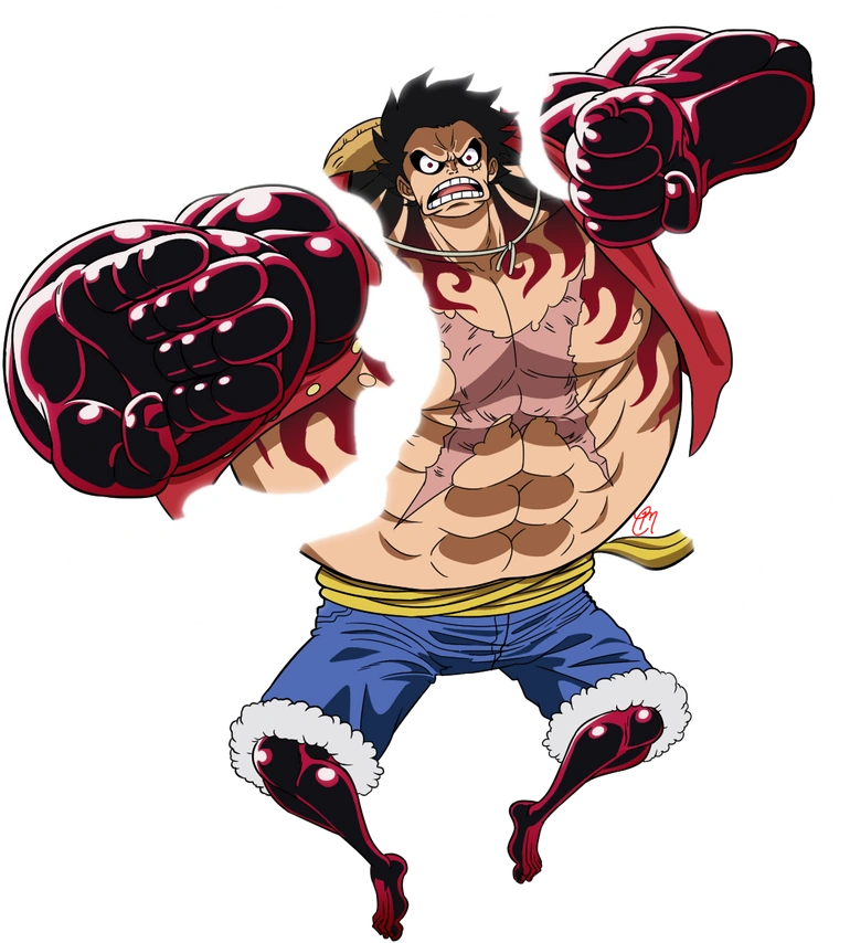 Attack Potency: Island level (Comparable to Don ChinJao, who with a help from Elizabelo, could stop a punch from Pica), higher with Gear 2nd (Stronger than in base), Island level+ with Gear 3rd (Destroyed Pica's head and pushed him away). Large Island level with Gear 4th (His power is increased by several times. Completely overpowered Doflamingo physically), higher with King Kong Gun (Tore through Doflamingo's god threads and oneshot him for good, alongside folding Dressrosa) | Island level (Stronger than before), higher with Gear 2nd, Island level+ with Gear 3rd. Large Island level with Gear 4th (Stronger than before), higher with King Kong Gun (Stronger than before) | Island level (Stronger than before), higher with Gear 2nd, Island level+ with Gear 3rd. Large Island level with Gear 4th (Stronger than before), higher with King Kong Gun (Stronger than before). Continent level with Haoshoku Infusion (Split the clouds of Onigashima), Continent level+ with Haoshoku Infusion+Gears | Multi-Continent level (Gear 5 is the peak of his power and amplifies his strength greatly), higher with Haoshoku Infusion, far higher with Bajrung Gun (Clashed with Flame Dragon Torch Kaido and later overpowered him)