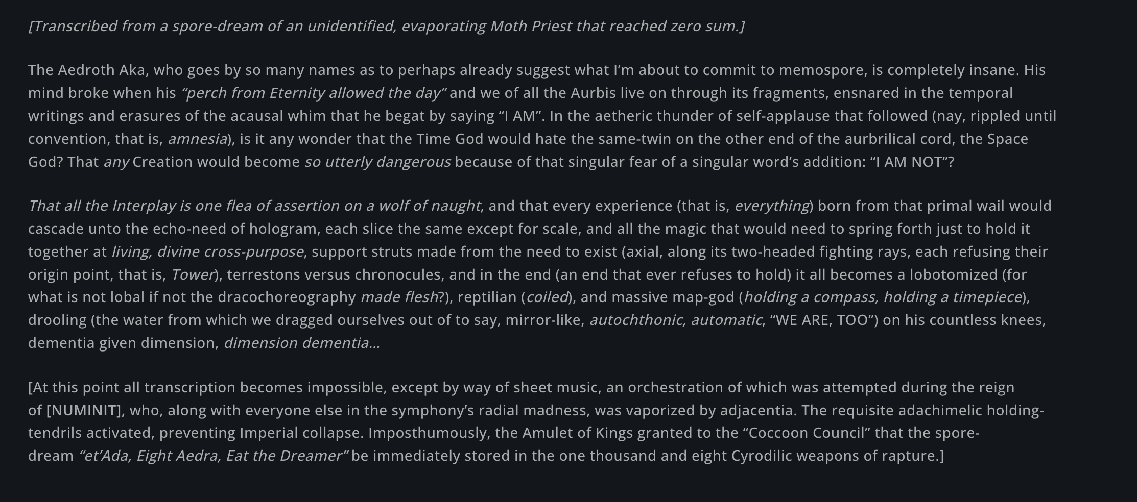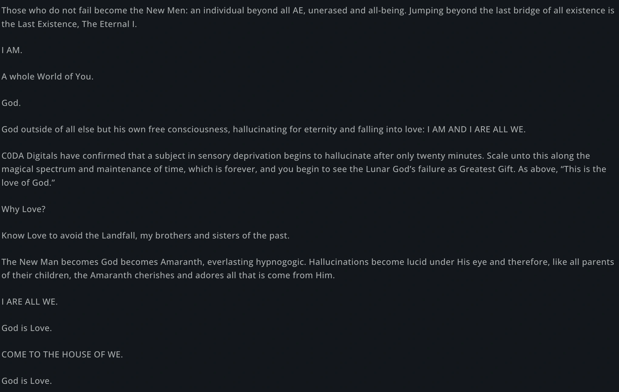 - Beyond CHIM, The Godhead/First Dreamer/The One/Amaranth is the dreamer of all existence where images are formed in dreams and it is the un-erased all-encompassing Eternal "I" that transcends all AE (Being-ness) and everything else. All things come from the Amaranth that includes Platonic Ideals, The Infinite Void, Logic, All Possibilities, Impossibility, Anu (IS/Everything/Existence) and Padomay (IS NOT/Nothing/Non-Existence).