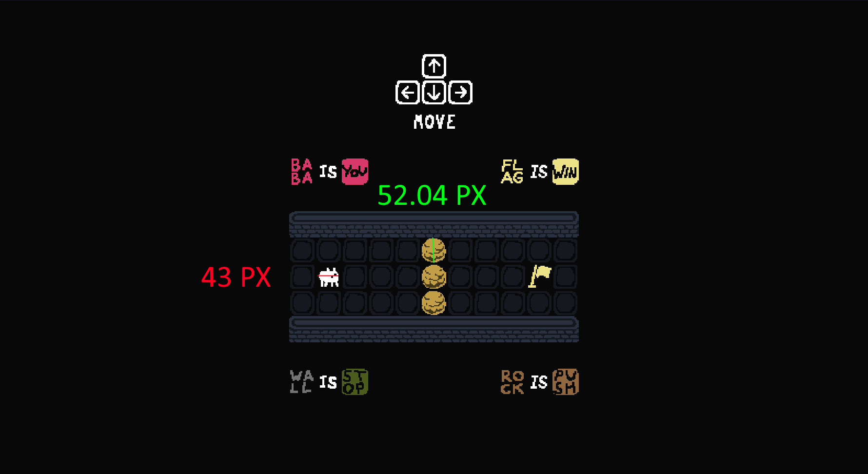 As mentioned above, we can apply Kinetic Energy to this but the issue is we don't know how fast BABA is actually moving...Is what we would say is if we didn't have the means to figure that out, which we do as we tend to. Since we know BABA is 1.3 meters, this means every tile/space would also be roughly the same lengthy and the amount of spaces a map can have is 18 (from what I've seen) from up to side